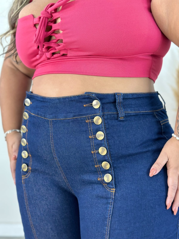 Fechamento com Botões Laterais: Os botões na lateral frontal são um detalhe charmoso e funcional. Eles adicionam um toque de estilo à calça e permitem um ajuste personalizado.
