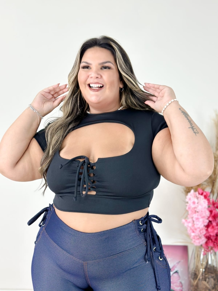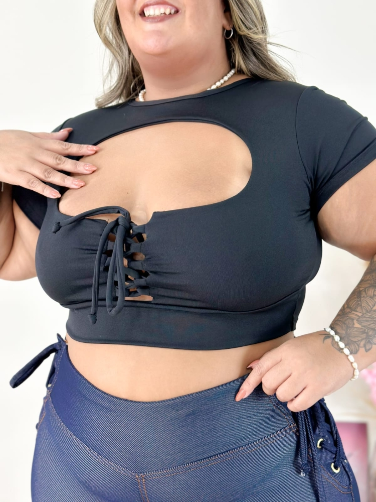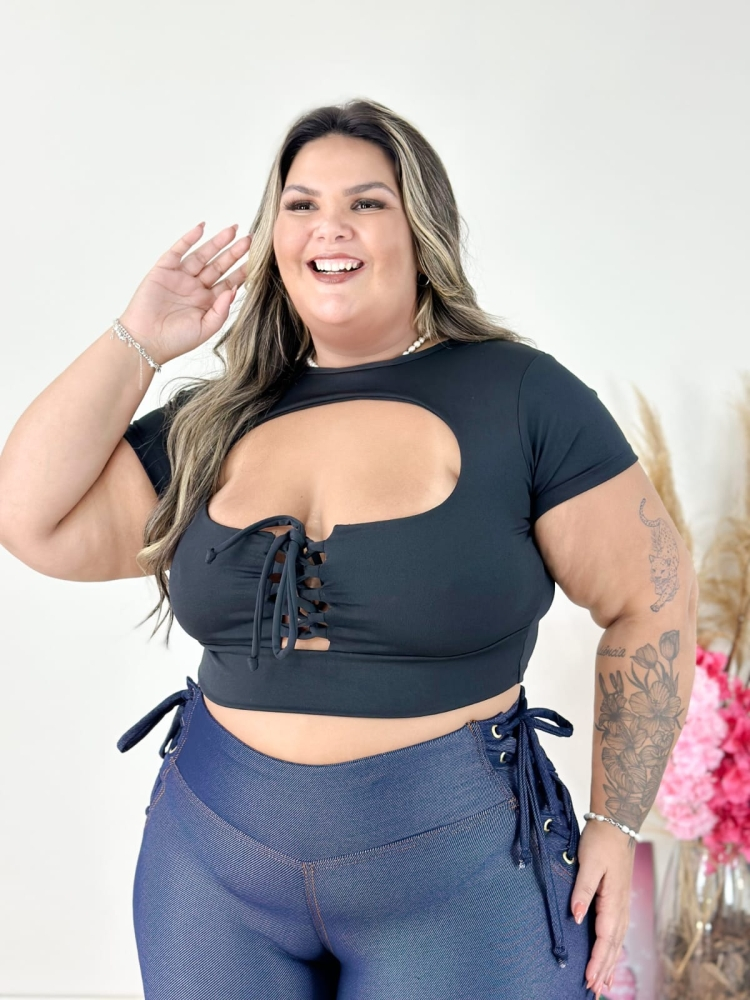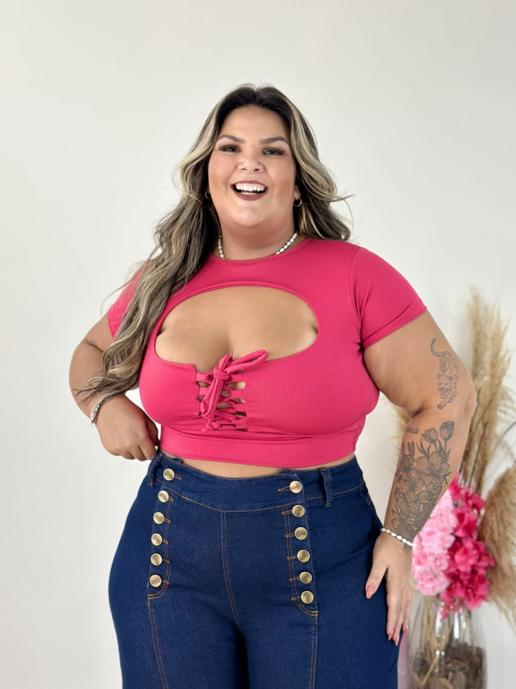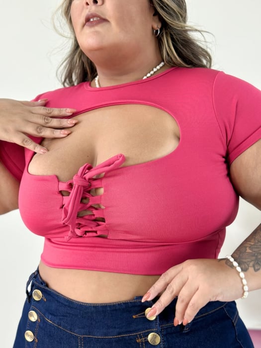 Cropped suplex confeccionado em poliéster e elastano. É aquela peça básica para ter no guarda-roupas.O modelo possui comprimento curto,mangas, forro interno e com abertura acima do busto e tira para amarração deixando um decote sexy. O suplex é uma fibra bastante flexível , durável, resistente e macia.