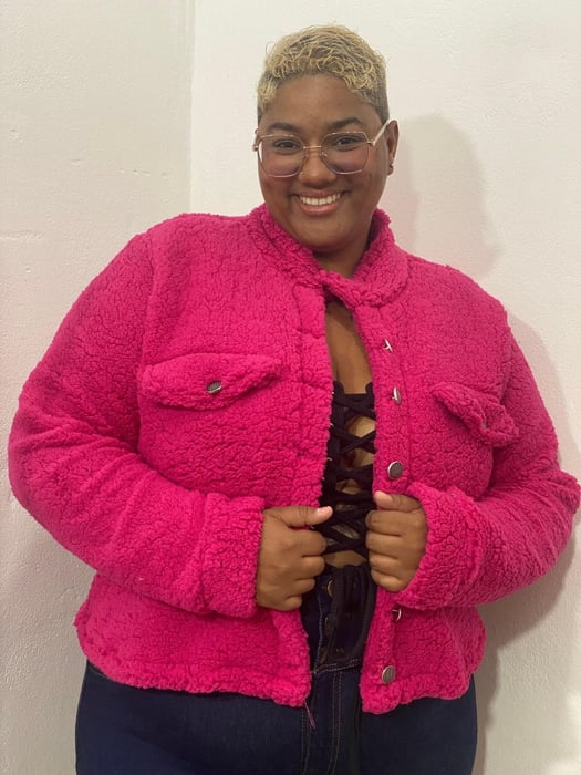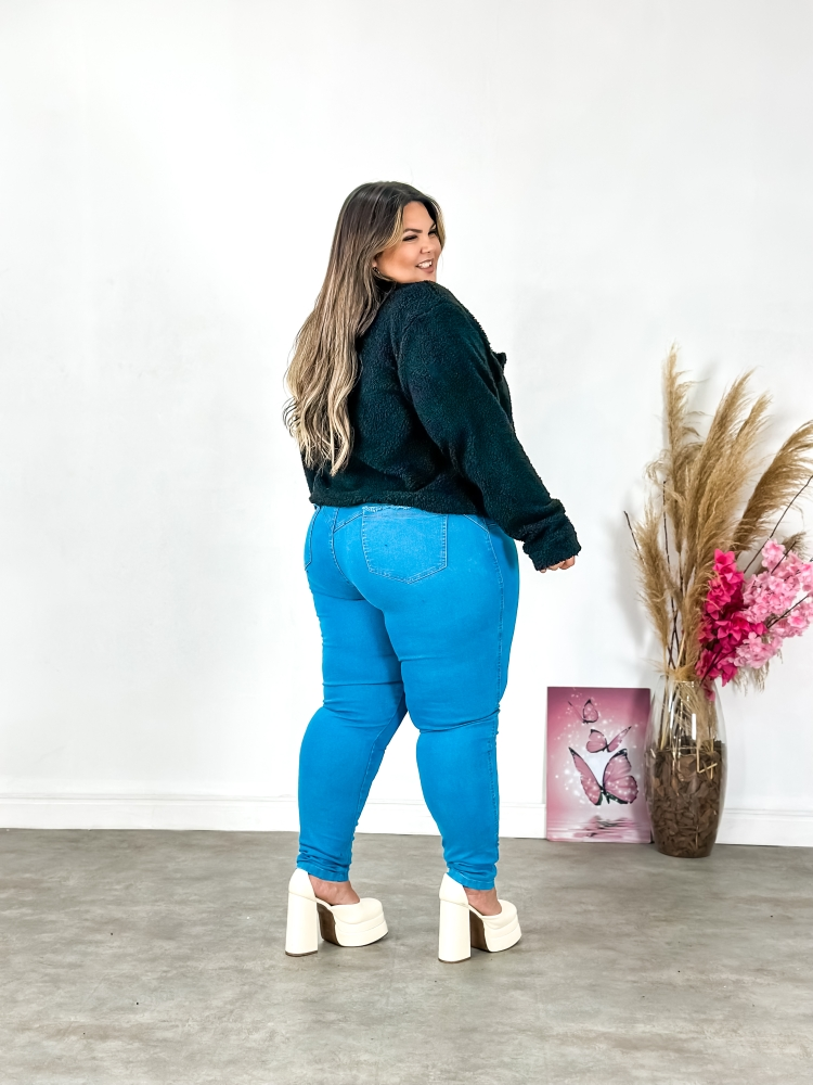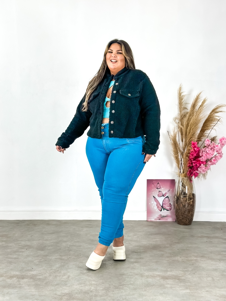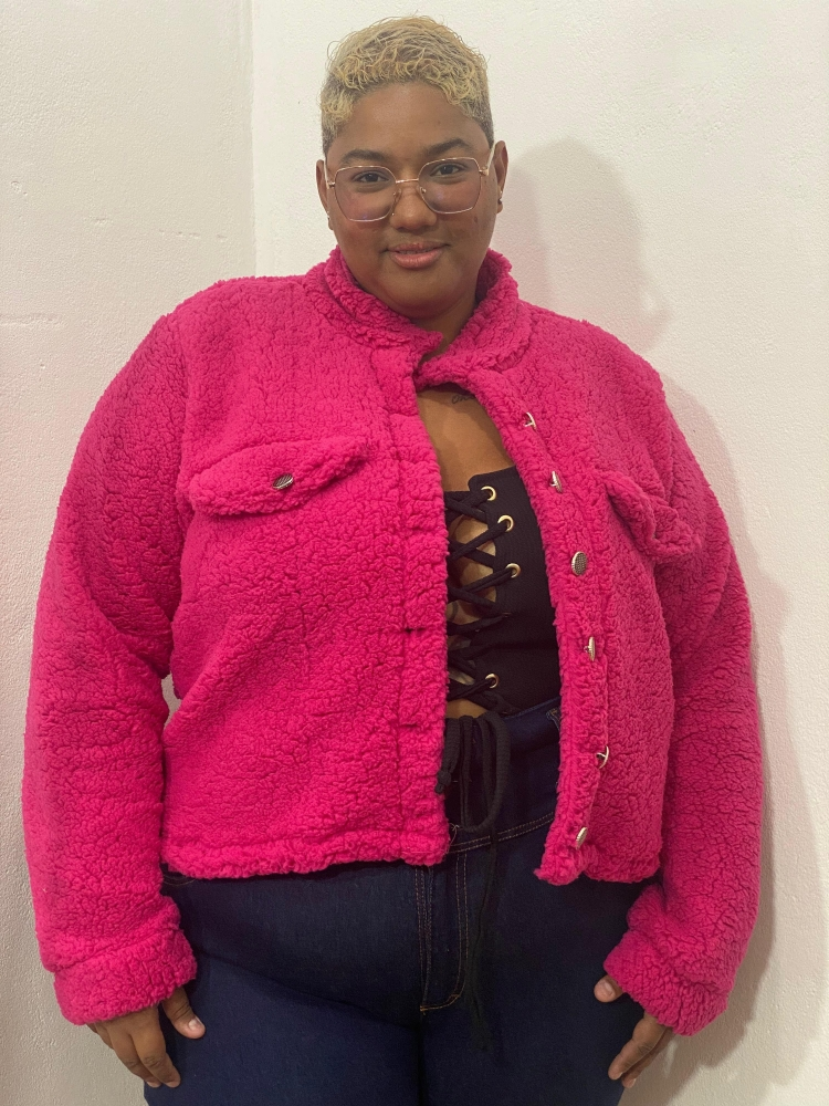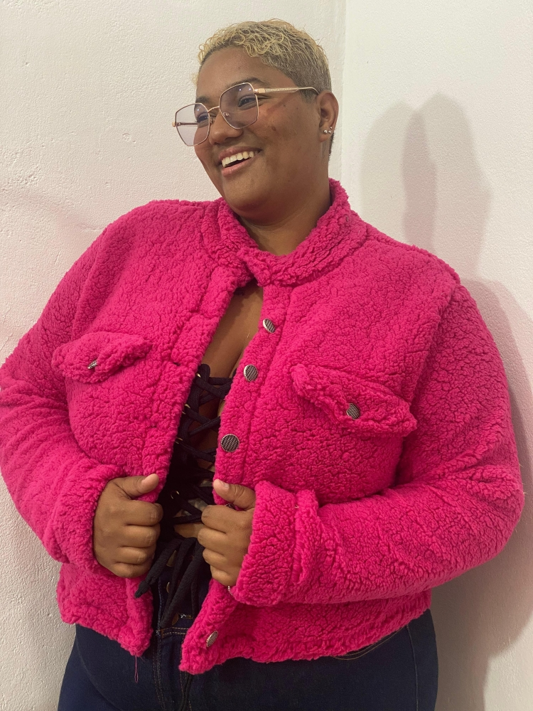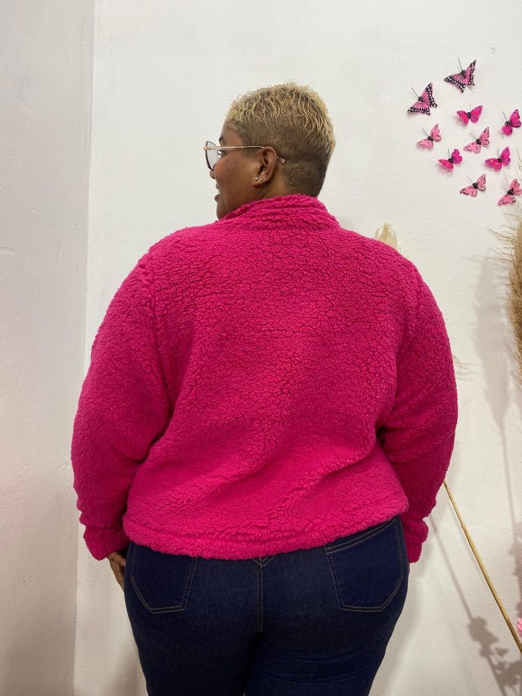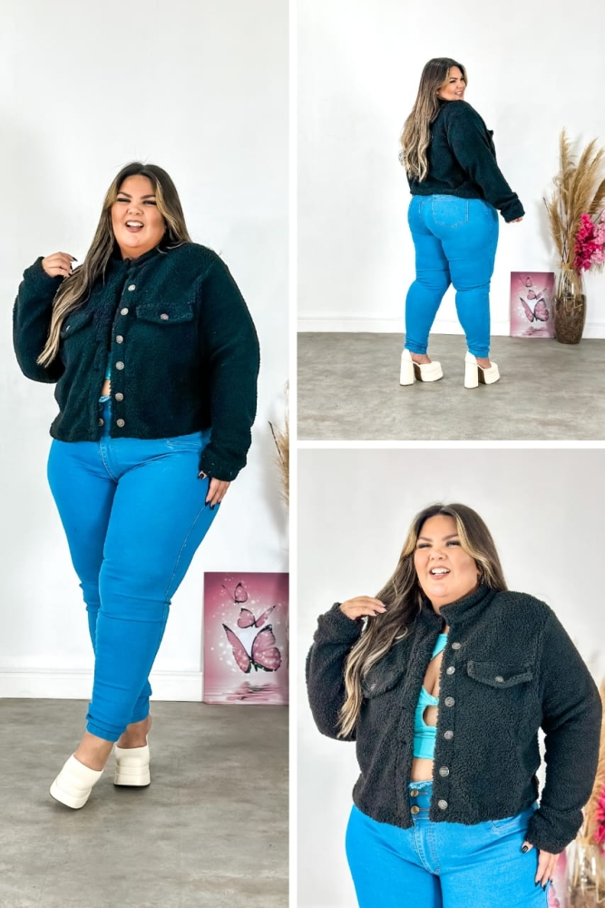 Casaco Tecido Peludinho com elasticidadeA modelo veste o tamanho XLCasaco de peloTecido 100% poliéster c/ uma leve elasticidadeComp-GG - 61XG - 62XL - 63EG - 64EXG - 65Largura busto e cós116124132140148Complemento manga 52 todos os tamanhosBícepsGG 44XG 48XL 52EG 56EXG 60Punho2627282930Gola de todos 50