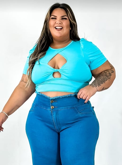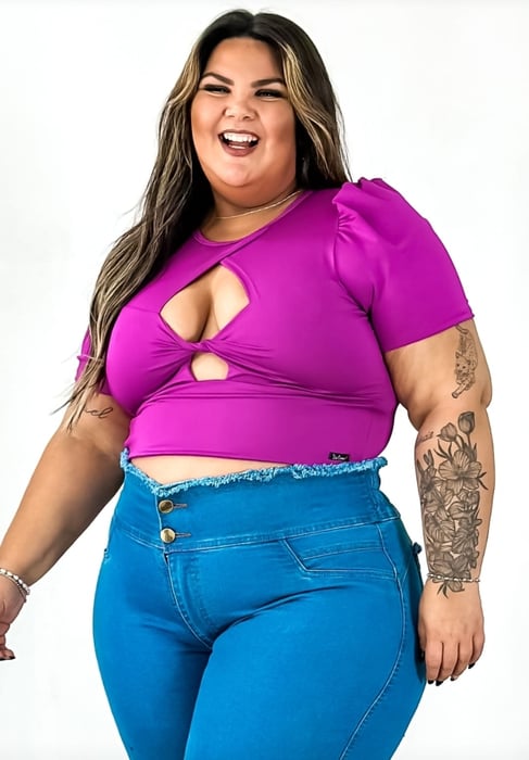 Descubra o charme e a elegância do nosso Cropped Plus Size em tecido suplex, especialmente desenhado para proporcionar conforto e estilo. Este modelo exclusivo apresenta mangas princesa, que adicionam um toque romântico e sofisticado ao visual. O detalhe torcido no busto com abertura é o destaque da peça, oferecendo um design moderno e atraente.