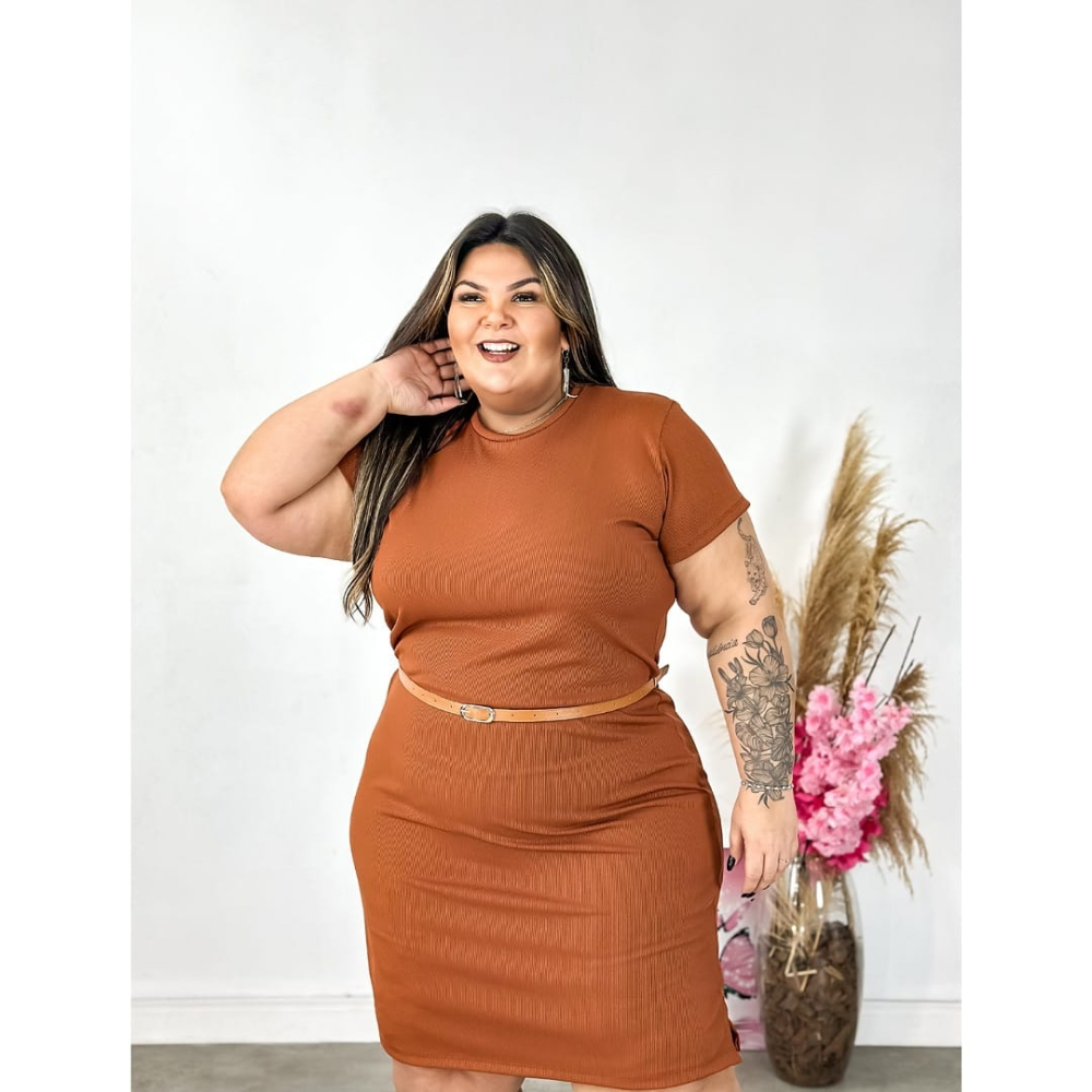 Vestido Midi Ribana Plus Size com Manga Curta e Cinto NÃO Incluso – a escolha perfeita para quem busca conforto e estilo em um só look!