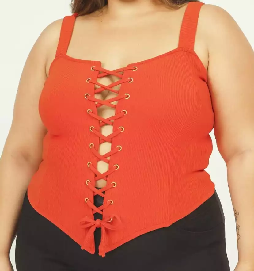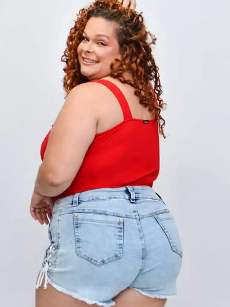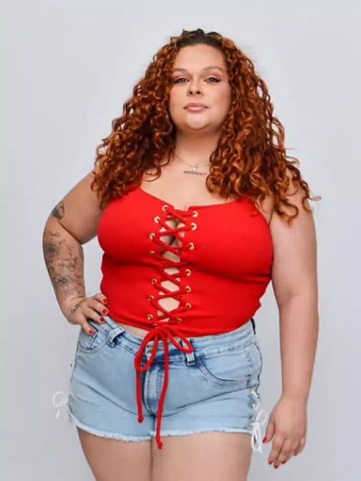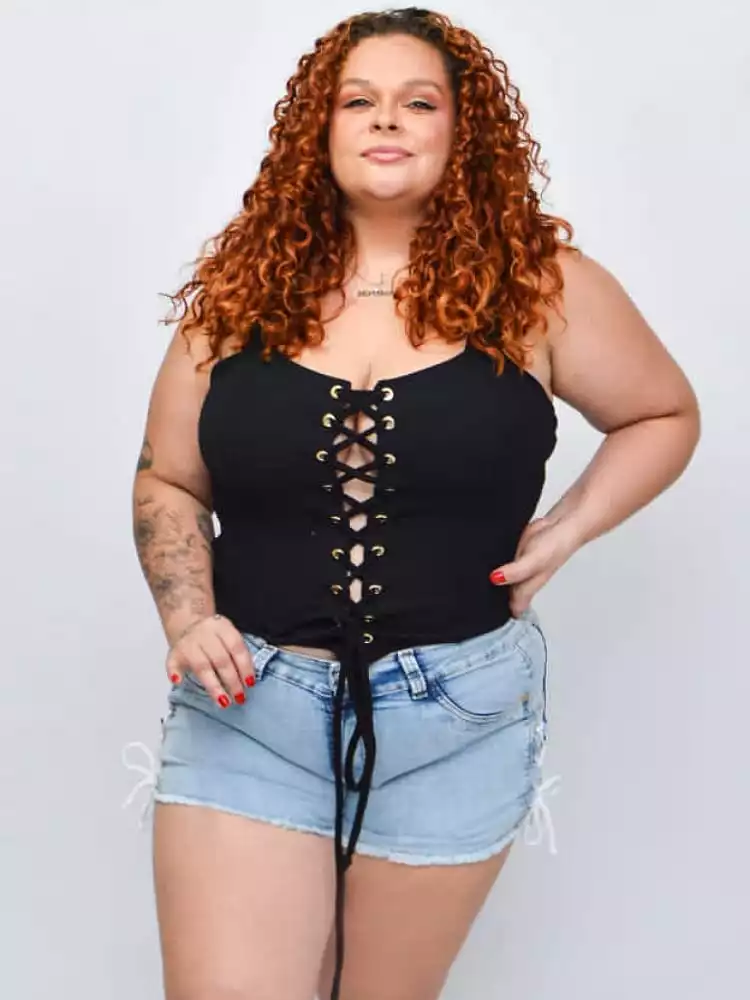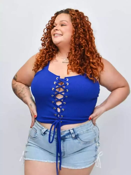 Disponível nos tamanhos 48 ao 58, o Cropped Iza Corpete é a escolha perfeita para quem busca estilo e conforto em uma única peça. A modelo da foto veste o tamanho G, demonstrando a versatilidade e o caimento impecável deste cropped.