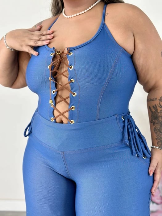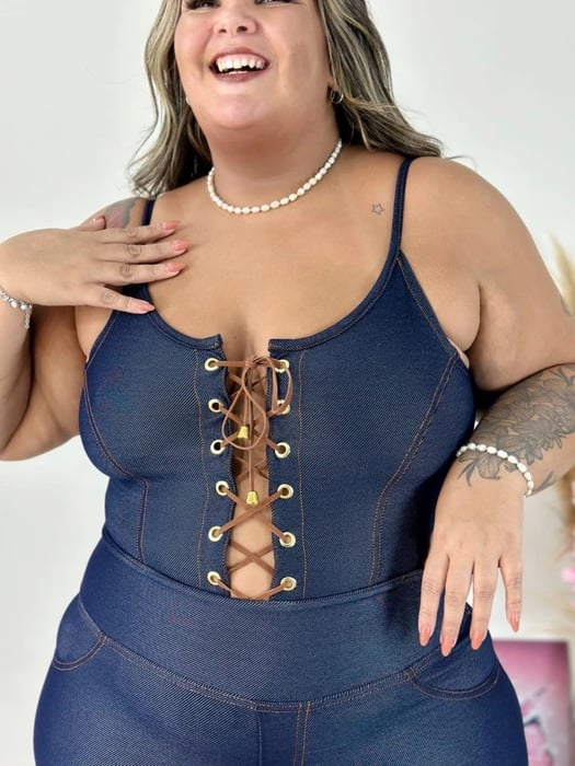 Na parte frontal, o body possui ilhóis estrategicamente posicionados. Esses detalhes adicionam um toque moderno e detalhes em cadarço.