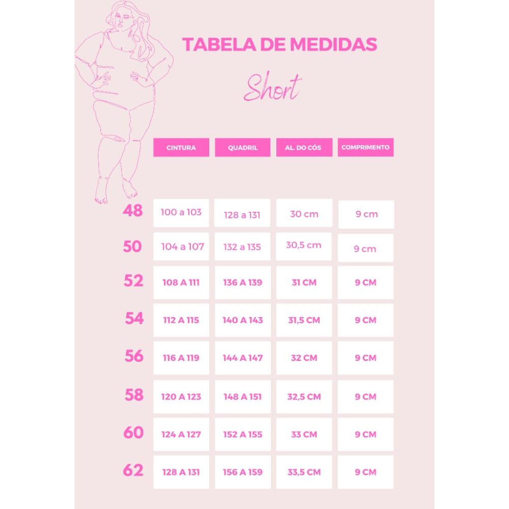 A modelo veste o tamanho 54Medidas:Tamanho 48 Cintura - 100 a 103 cm / Quadril - 128 a 131 cm.Tamanho 50 Cintura - 104 a 107 cm / Quadril - 132 a 135 cm.Tamanho 52 Cintura - 108 a 111 cm / Quadril - 136 a 139 cm.Tamanho 54 Cintura - 112 a 115 cm / Quadril - 140 a 143 cm.Tamanho 56 Cintura - 116 a 119 cm / Quadril - 144 a 148 cm.Tamanho 58 Cintura - 120 a 123 cm / Quadril - 149 a 152 cm.Tamanho 60 Cintura - 124 a 126 cm / Quadril - 153 a 156 cm.Tamanho 62 Cintura - 127 a 130 cm / Quadril - 157 a 160 cm